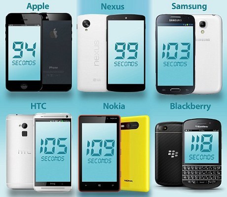 Berturut turut kemudian adalah pengguna Samsung dengan 103 detik, HTC dengan 105 detik, Nokia dengan 109 detik dan terakhir pengguna BlackBerry dengan raihan waktu 118 detik.